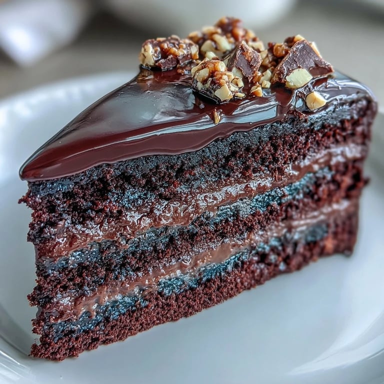 This chocolate celebration cake features moist olive oil layers infused with cocoa and coffee, generously filled and frosted with silky bittersweet ganache, then adorned with homemade hazelnut praline shards. The olive oil keeps the crumb tender while the praline adds irresistible crunch. Perfect for birthdays, holidays, or any moment worth celebrating with an elegant, deeply flavored dessert.