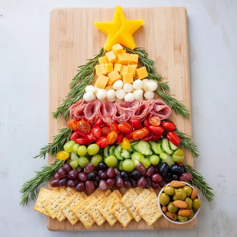 Save A festive and colorful appetizer platter, artfully arranged in the shape of a Christmas tree with an array of cheeses, cured meats, fruits, and crackers. Perfect for holiday gatherings and easy entertaining.
