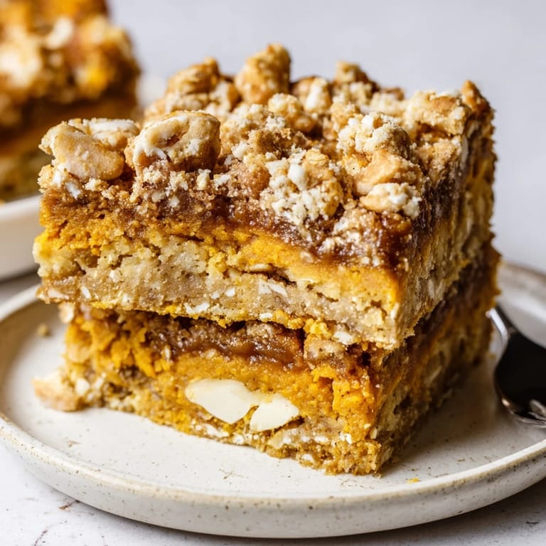 Save Chewy, autumn-inspired blondies featuring a spiced pumpkin base, a layer of smooth pumpkin pie filling, and a sweet coffee crunch topping for a delightful seasonal treat.