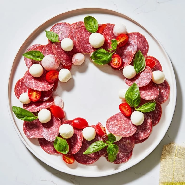 Save A striking and simple appetizer featuring thinly sliced salami artfully folded and arranged in a wreath patternβideal for festive gatherings or charcuterie boards.
