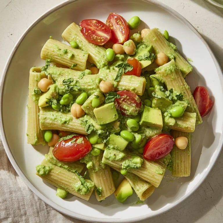 - In a large bowl, combine cooked pasta, chickpeas, edamame, cucumber, spinach, cherry tomatoes, avocado, spring onions, parsley, and basil.