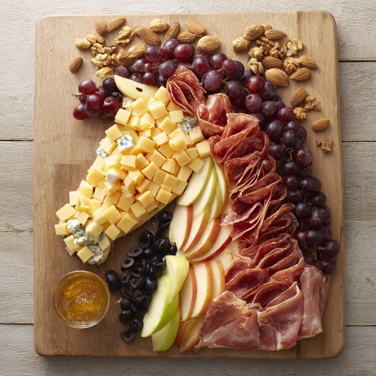 Save A whimsical and impressive appetizer platter arranged in the shape of a horse featuring a variety of cheeses charcuterie fruits nuts and accompaniments—perfect for parties or themed celebrations.