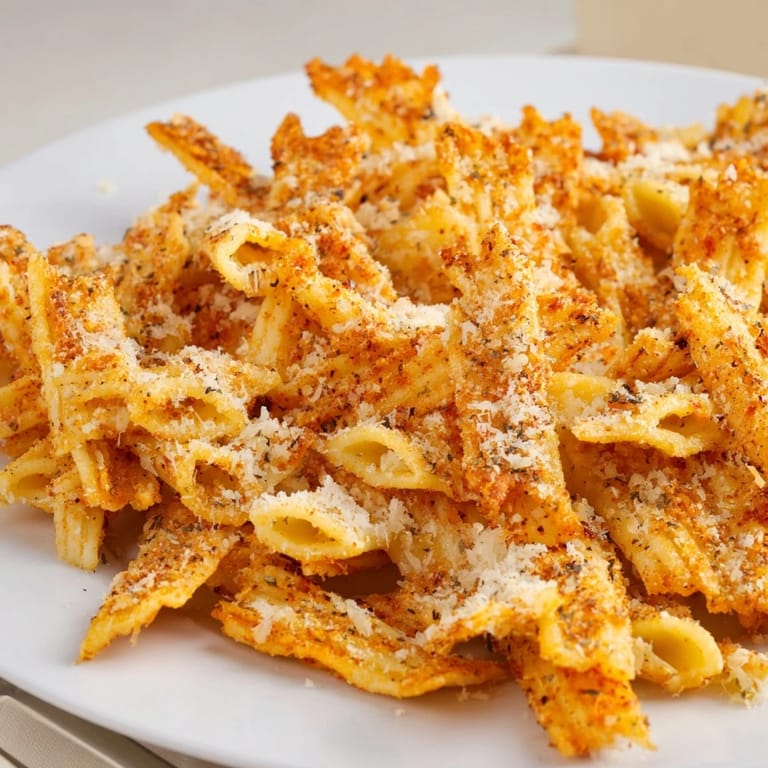 Save Crispy baked pasta chips tossed with a flavorful blend of seasonings, perfect for snacking or serving with dips.