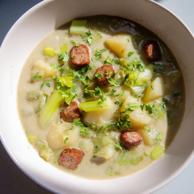 Save A hearty and flavorful soup combining creamy potatoes, tender leeks, and spicy chorizo for a comforting meal perfect for cool days.