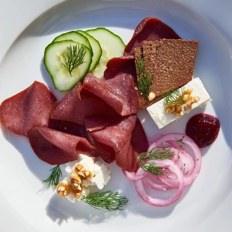Thinly sliced cured reindeer and air-dried reindeer sausage form the centerpiece of this Nordic platter.
