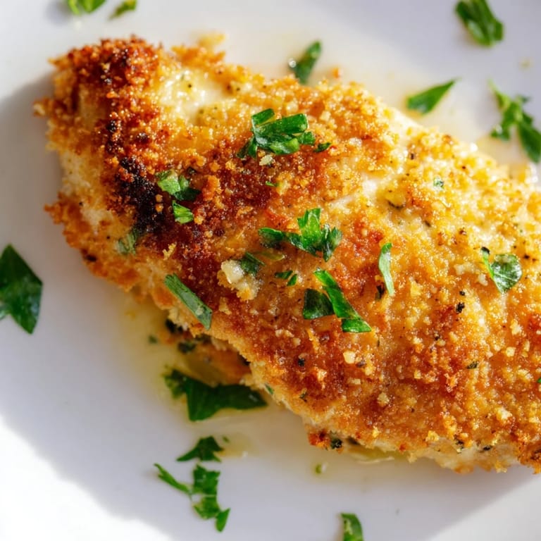 Pair this chicken with fresh green salads, roasted seasonal vegetables, creamy mashed potatoes, or steamed rice. A light lemon vinaigrette or garlic aioli complements the savory Parmesan crust beautifully.