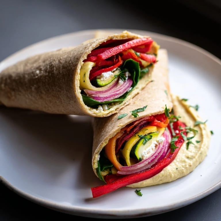 Save A vibrant, nutritious wrap featuring creamy hummus and beautifully roasted vegetables, folded into a clever, mess-free snowflake wrap for a satisfying lunch or dinner.