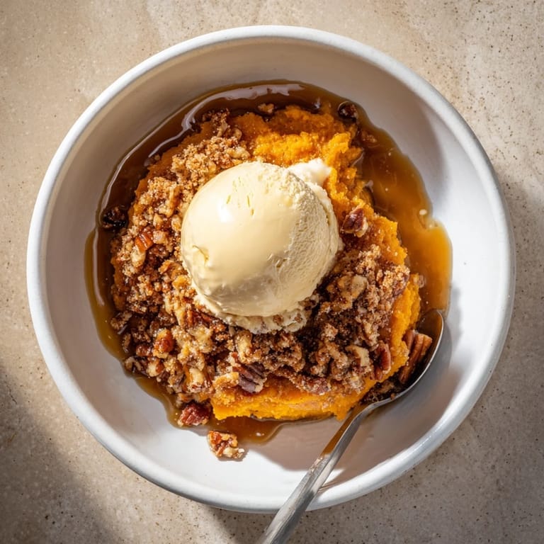 Save A creative twist on the classic sweet potato casserole, this dessert features creamy sweet potato, a crunchy pecan topping, and a scoop of vanilla ice cream floating in a pool of warm, spiced caramel sauce.