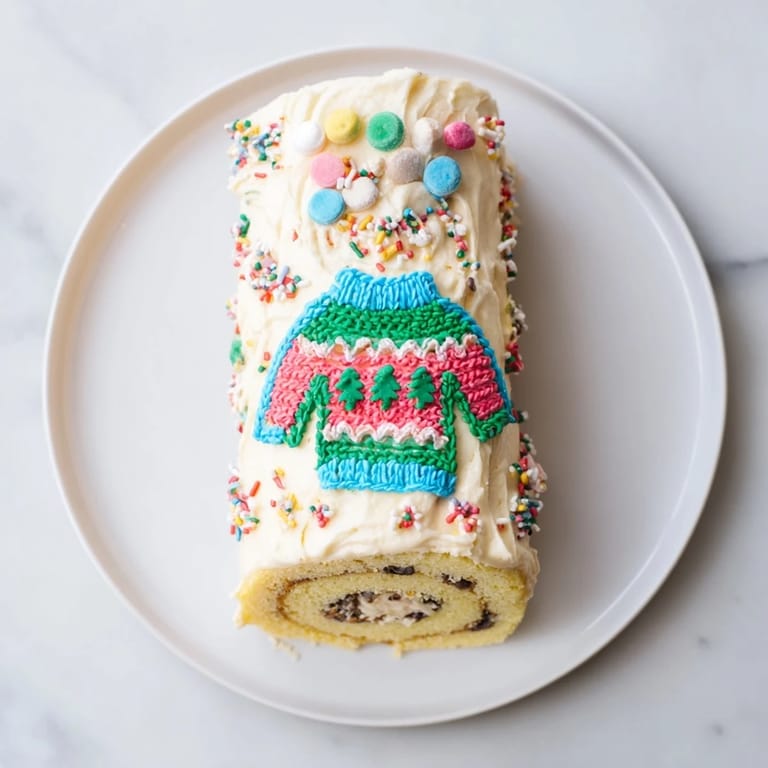 Save A festive, whimsical cake roll inspired by ugly holiday sweaters, made easy with store-bought cake and playful decorations. Perfect for parties or a cheerful dessert table.