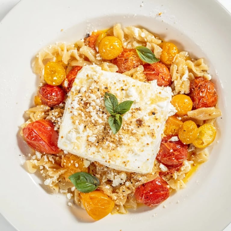 This Mediterranean-inspired dish combines a block of oven-baked feta cheese with bursting cherry tomatoes, garlic, and aromatic herbs. The softened cheese is mixed with hot pasta, creating a rich, creamy sauce enhanced by a snowfall of grated Parmesan and fresh basil garnish. It's a simple yet flavorful dish that brings warmth and festive charm to the dinner table, perfect for easy preparation and a celebratory meal.