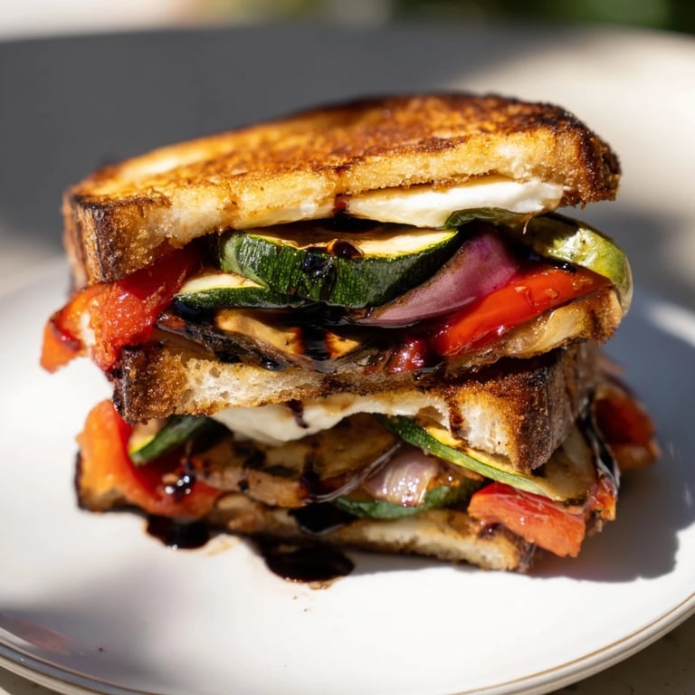 This dish combines roasted zucchini, bell pepper, and red onion caramelized to perfection, layered with fresh mozzarella, juicy tomato slices, and fragrant basil leaves. All ingredients are tucked between buttered sourdough slices, grilled until golden and melty. The result offers a harmonious blend of savory roasted vegetables and creamy cheese contrasted with crisp bread. Ideal for a satisfying vegetarian main course, it's effortless to prepare and customizable with seasonal produce or added spice. A drizzle of balsamic glaze enhances the richness and brightness of flavors.