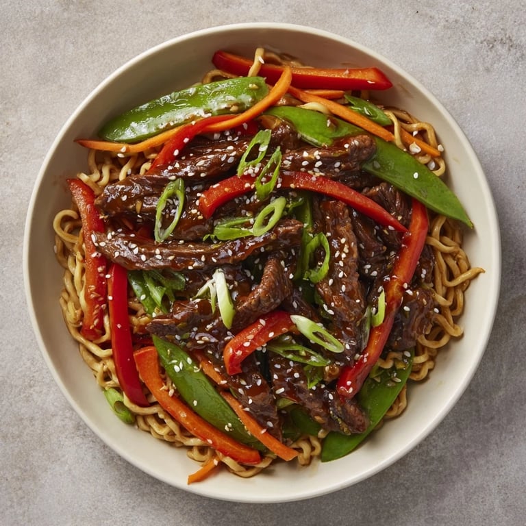 Save Tender strips of beef stir-fried with crisp vegetables and tossed in a savory-sweet teriyaki sauce, served over noodles for a satisfying Asian-inspired meal.