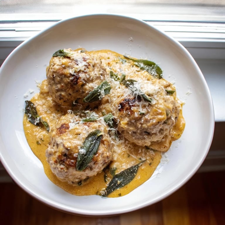Save Juicy turkey meatballs are simmered in a creamy, aromatic pumpkin sage sauce, capturing the essence of fall. Serve over pasta, mashed potatoes, or polenta for the ultimate comfort meal.